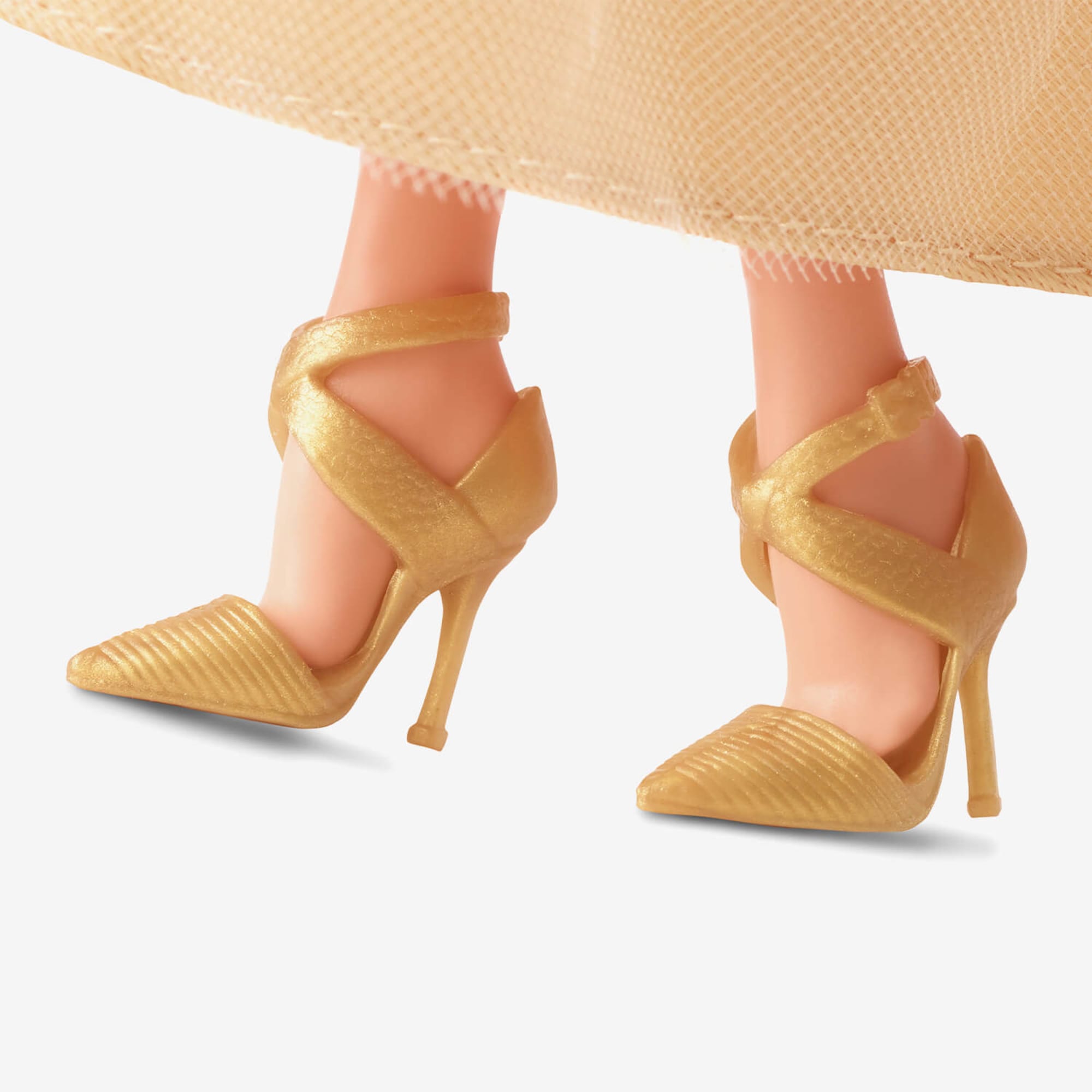 Marking the 35th anniversary of Holiday Barbie. this elegant doll shines with all the good will and brightness of the season. Her champagne-colored satiny dress features a tulle skirt overlay that shimmers with gold stars. A pleated sheer cape ties at the neck with an ivory satin ribbon. while golden statement earrings and a sculpted golden wrist cuff add seasonal sparkle.