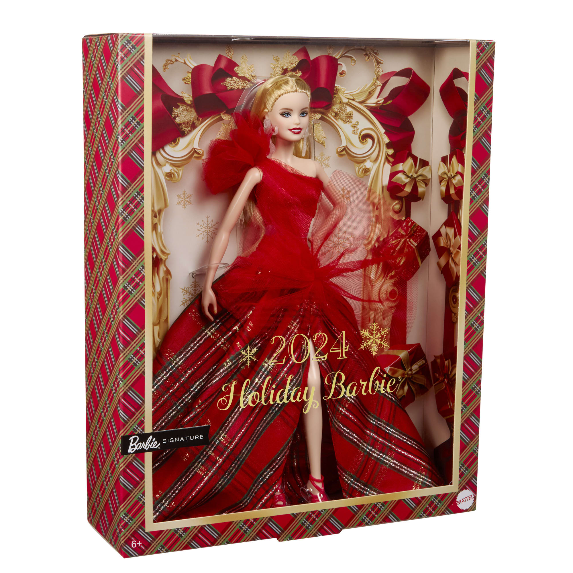 The 2024 Barbie Holiday Doll embodies the warmth and love of the season with a festive gown for a glamorous celebration. Showcasing gorgeous drama. the dress pairs a draping. one-shoulder. sparkling red bodice with a full. plaid ballgown-style skirt. Big tulle accents offer a modern take on a classic look. while statement earrings add to the elegance. In packaging that’s ideal for display. this collectible doll makes a great gift for anyone looking to build a collection or brighten up their seasonal decorations.