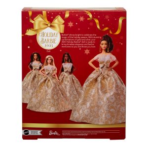 The 2025 Barbie Holiday Doll is ready to embrace the delights of the season in style. She’s dressed for festive revelry in a voluminous gown with a silver and golden brocade pattern – an homage to holiday décor. The dress is packed with glamorous details. including a dramatic tulle-accented neckline and an oversized bow. complemented by cascading golden earrings and matching mules. In packaging that’s ideal for display. this doll is a perfect addition to collections or holiday wish lists.