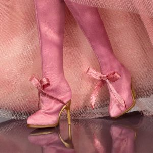 In our new series. Barbie explores couture throughout history. edited with a contemporary view. Inspired by the 18th century. our first doll wears a floral jacquard gown with puff sleeves and balloon skirt stitched high to reveal her petticoat and satin knee-high boots. All eyes lay on her pink papillote curls piled tall and tied with a little black bow. Wearing mesh fingerless gloves. Barbie doll extends her hand to have this dance with collectors and fashion aficionados everywhere.