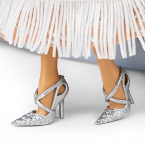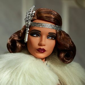 For the second entry in our history-inspired fantasy series. Barbie celebrates the Roaring Twenties in luxurious flapper-inspired couture. The shimmery nude gown drips with fringe details that sway with her every dance move. Heads will turn at the dramatic sweep of her powder-blue cape. which adds even more elegance to this elevated Art Deco look. Accessorized with a draping pearl necklace and matching headpiece. our premium doll will razzle-dazzle collectors and fashion fans alike.