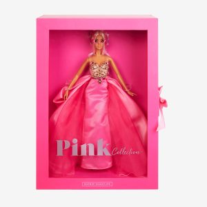 Classic Barbie glamour meets on-trend fashions in the stunning Barbie Pink Collection. Our fifth doll is the first Asian Barbie in this series. making a dazzling debut in an all-pink ensemble featuring a satin skirt paired with a golden top that sparkles with pink stones. Her look is enhanced with a pink-dusted blonde updo. floating lens sunglasses. and transparent pink mules. This will be the last doll in the series. making this a true collector’s piece.