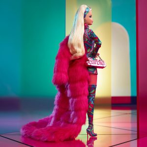 Inspired by the swinging ’60s pop art. Barbie doll makes the scene with a dramatic. hot pink faux fur coat and saturated psychedelic prints that swirl from head to toe. Her mod minidress features a hemline that rose to fame in this era. while matching thigh-high boots are made for dancing-a-go-go. Pops of hot pink in her fab jewelry and a Barbie logo purse finish her look. Giving self-confident side-eye and a pink pouty lip. Barbie is all beauty. love. and feelin’ groovy.