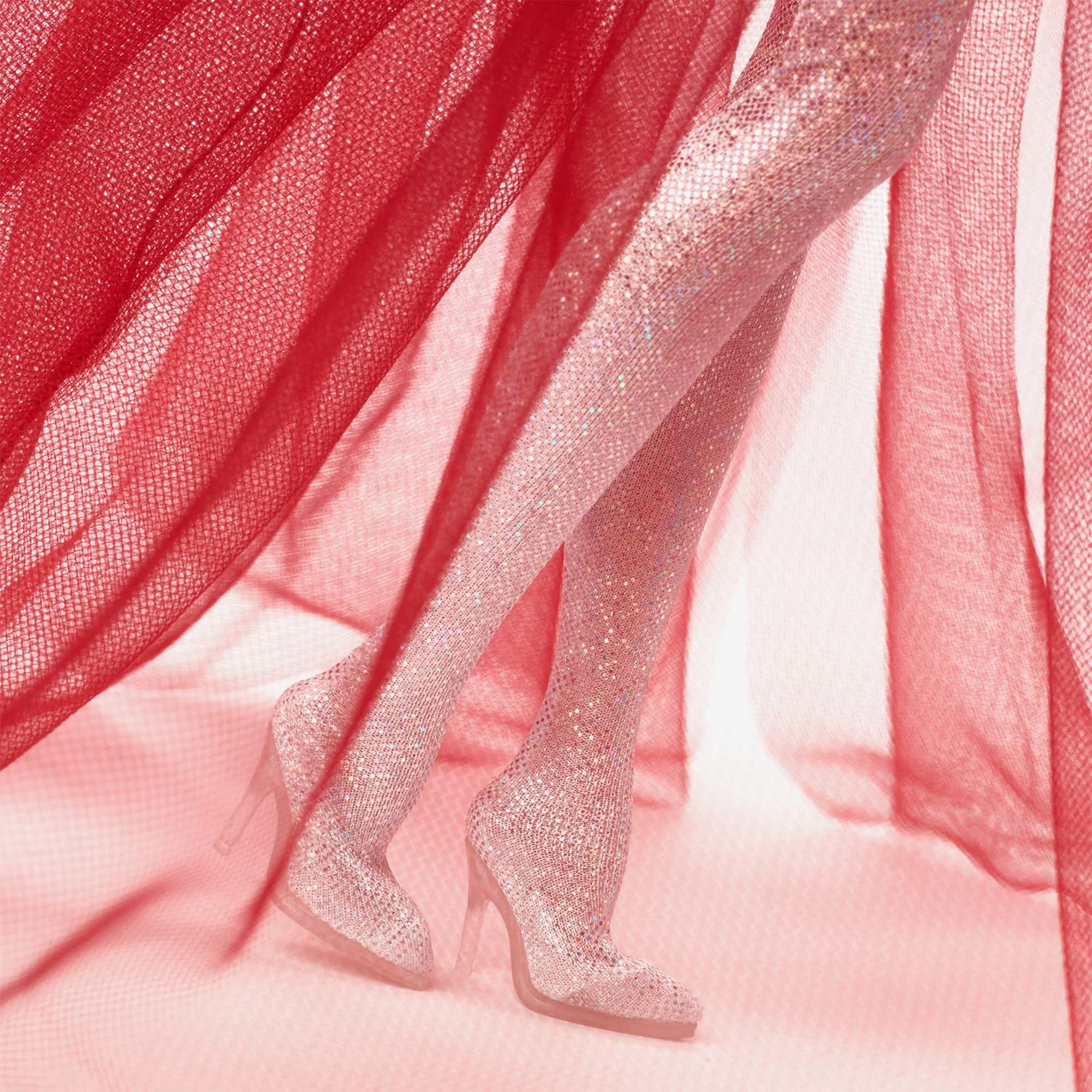 As a four-time Emmy-nominated actress. Emmy-winning producer. and the first transgender woman of color to have a leading role on a scripted TV show. Laverne Cox uses her voice to amplify the message of moving beyond societal expectations to live more authentically. She wears a triple-threat original design. featuring a deep red tulle gown gracefully draped over a dazzling. silver metallic bodysuit. Her hair is swept into glamorous Hollywood waves while dramatic makeup completes her look.