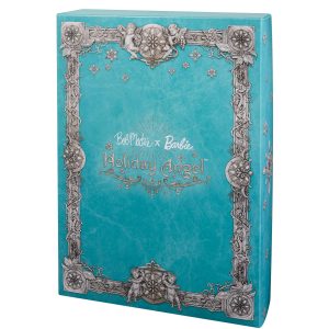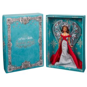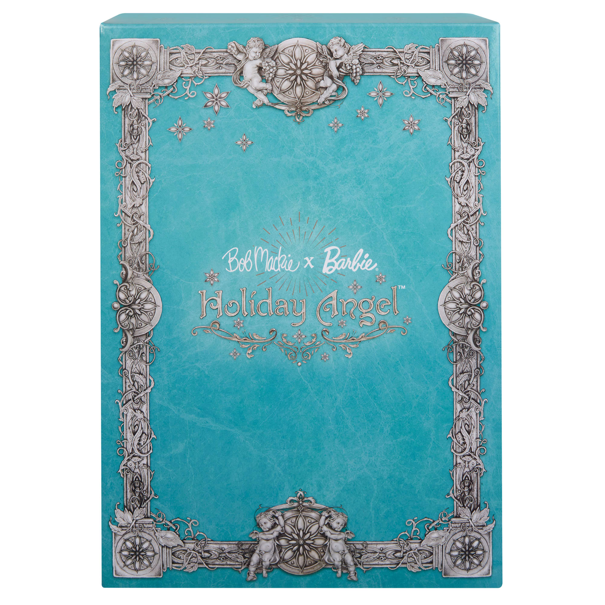 Internationally acclaimed costume and fashion designer Bob Mackie once again partners with Barbie to create a gorgeous Holiday Angel doll. She sparkles like starlight in a shimmering silver gown. with a crimson sash that drapes around her bodice and cascades to the floor in a shock of festive color. Glittery wings soar behind her. while drop earrings and stacked bracelets enhance her celestial sparkle.
