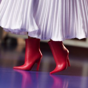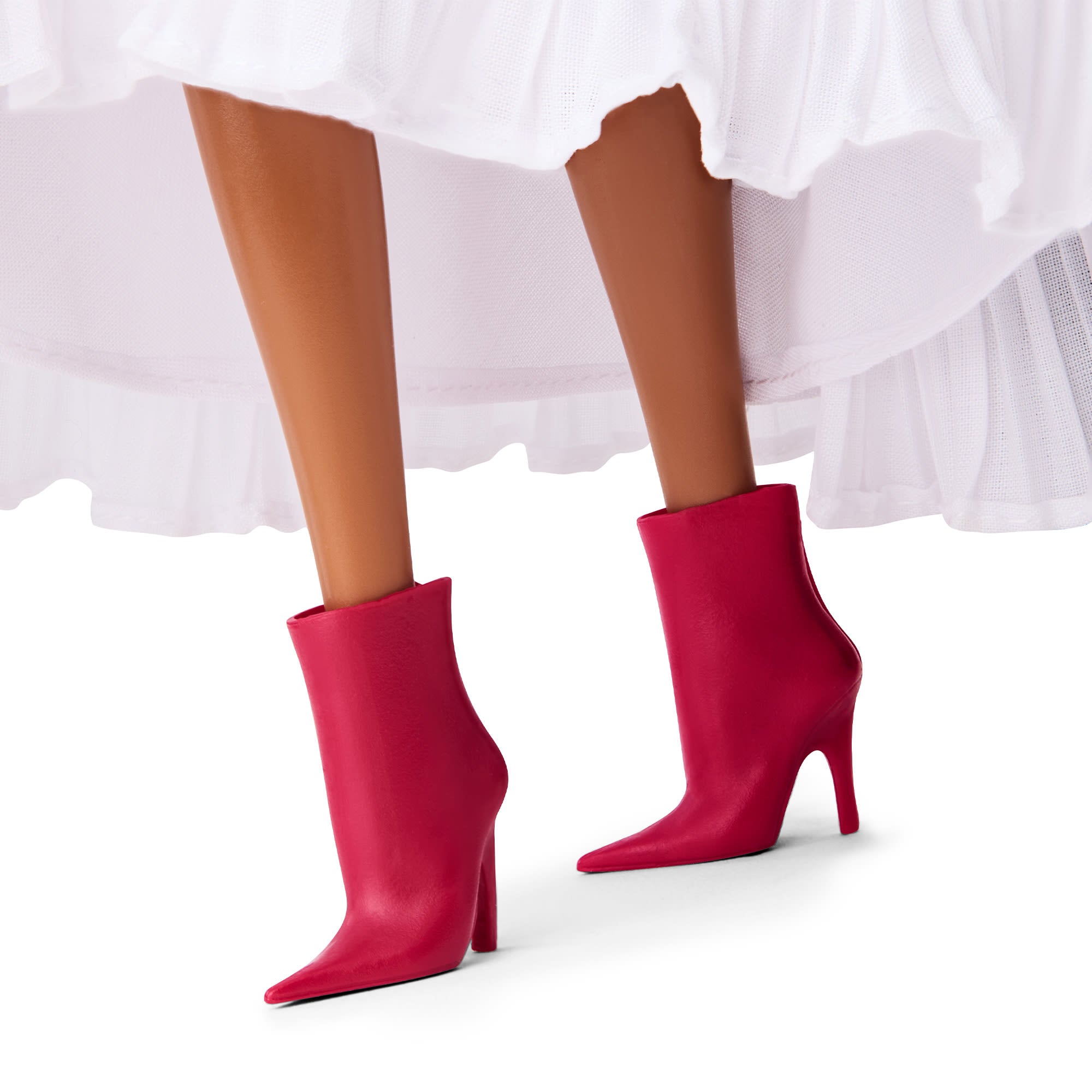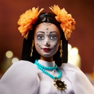 In honor of Día de Muertos. Barbie teams with renowned Mexican designer Kris Goyri to celebrate this festival of remembrance. Showcasing Goyri’s signature fusion of traditional Mexican culture with modern elements. Barbie doll wears a pleated white gown with voluminous sleeves. accented by vibrant marigold flowers and a festive headpiece. Her look is complete with a turquoise necklace featuring a radiant golden pendant. plus matching earrings. and bold burgundy boots.