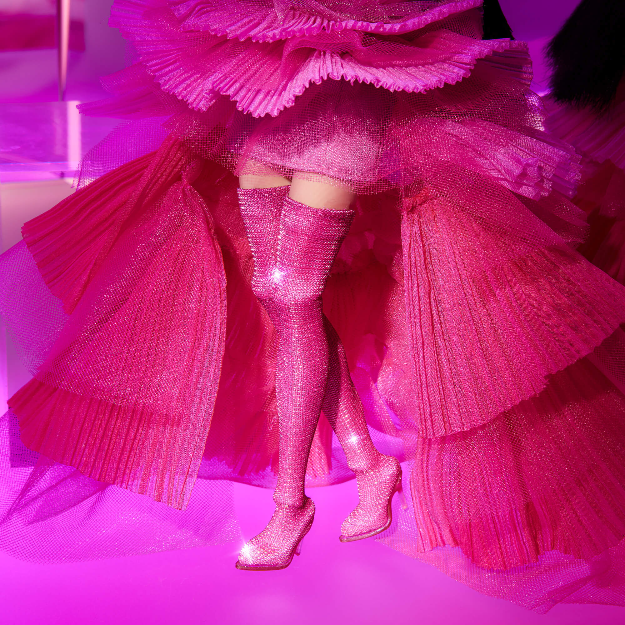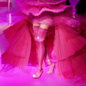 - Barbie doll wears a vinyl pink-foil power suit and a silvery metallic corset