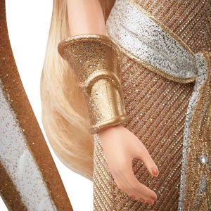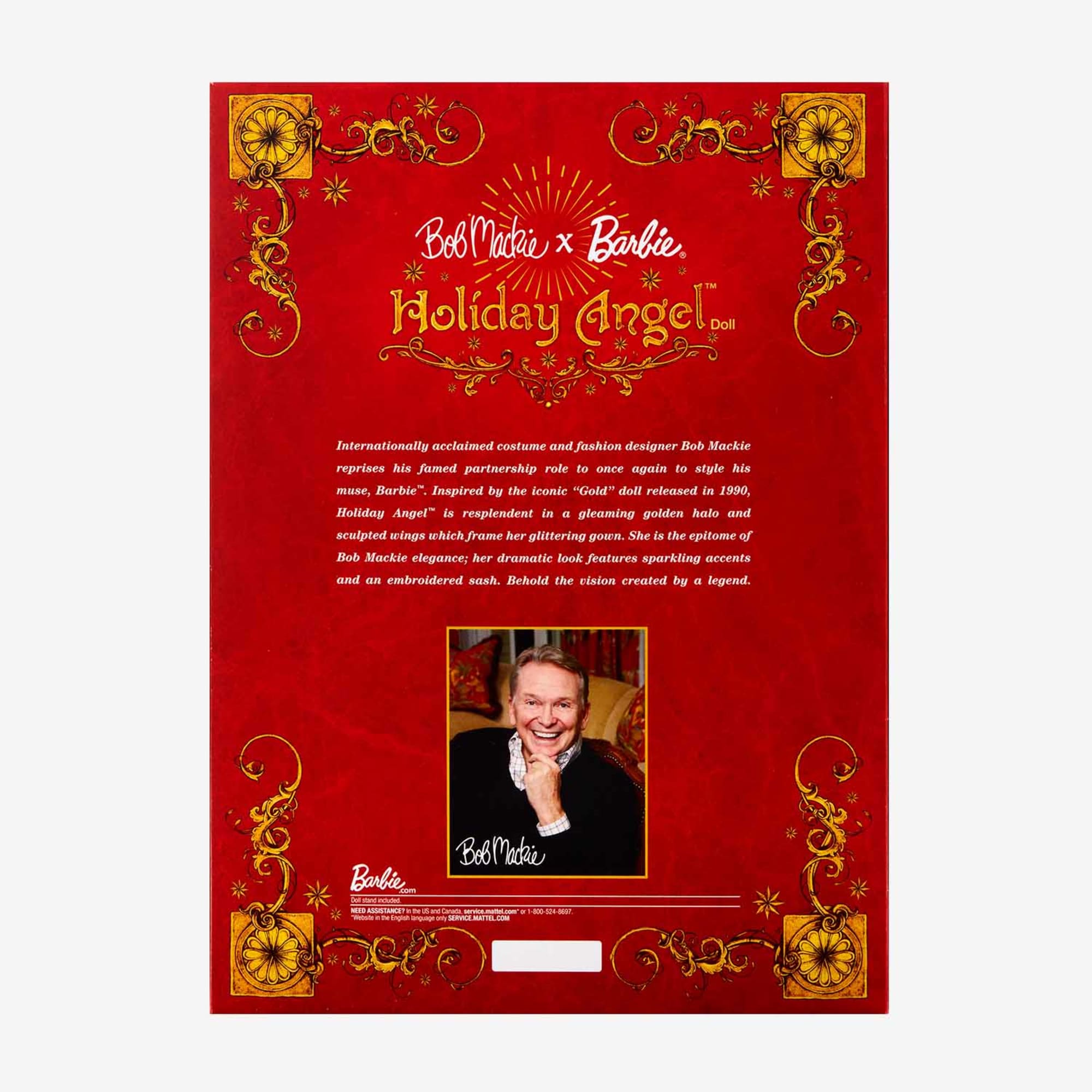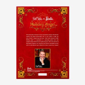 Internationally acclaimed costume and fashion designer Bob Mackie reprises his famed partnership role with one of his style muses. Barbie doll. Framed by soaring sparkly wings and a luminous halo. her striking gown is draped with an embroidered sash and shimmers from every angle as if dipped in gold. May this Bob Mackie x Barbie doll be a source of light and magic for years to come.