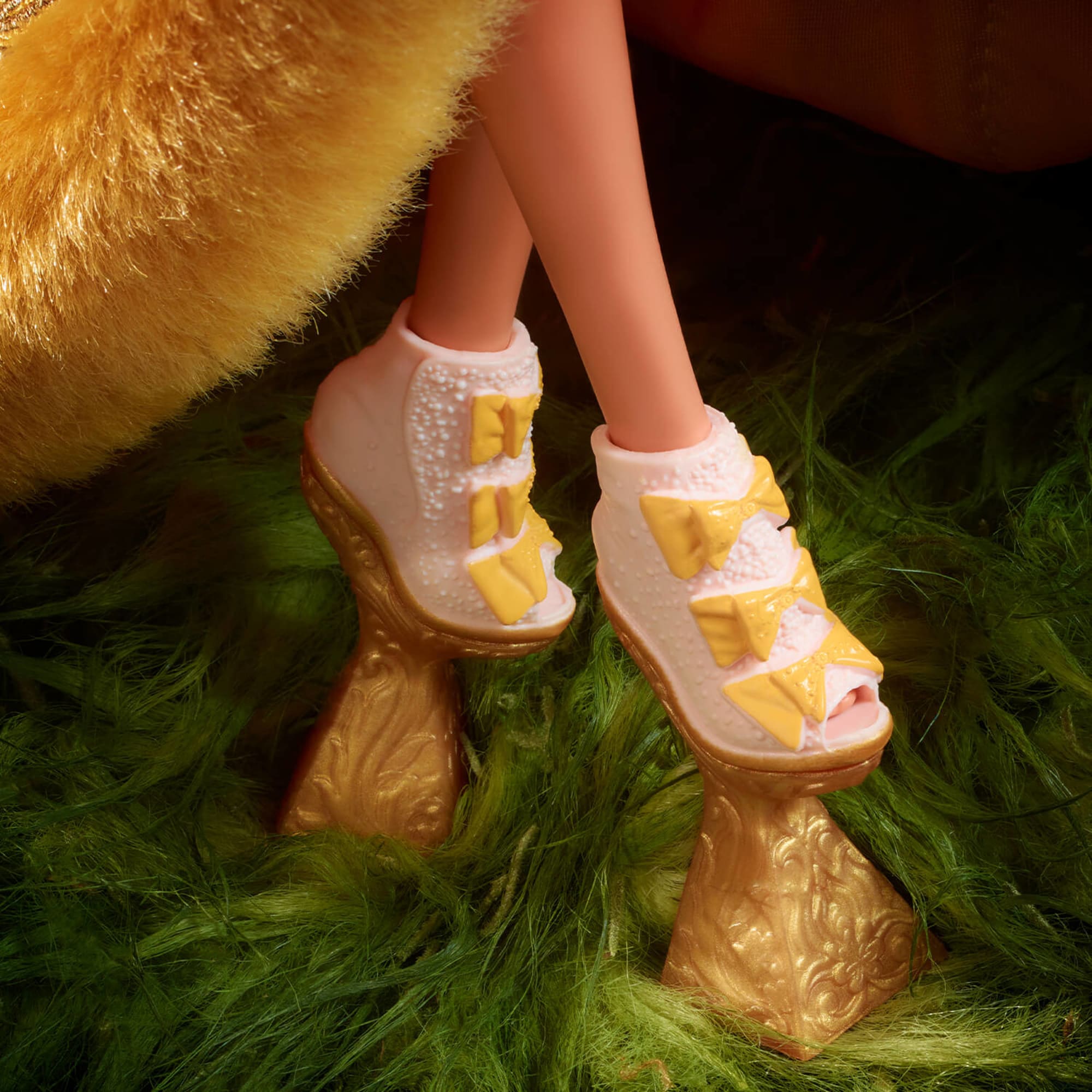 As one of China’s most renowned couturiers. Guo Pei combines her rich cultural heritage with contemporary innovation. She brings this unique combination to life with the intricacy of her signature royal embroidery craftmanship. Barbie doll dazzles in a couture look inspired by Guo Pei’s original design. using a color once reserved for Chinese nobility. The stunning brocade gown features ornate embroidered details and a faux fur trim. A striking golden headpiece. golden accessories. and high-fashion shoes complete her look.