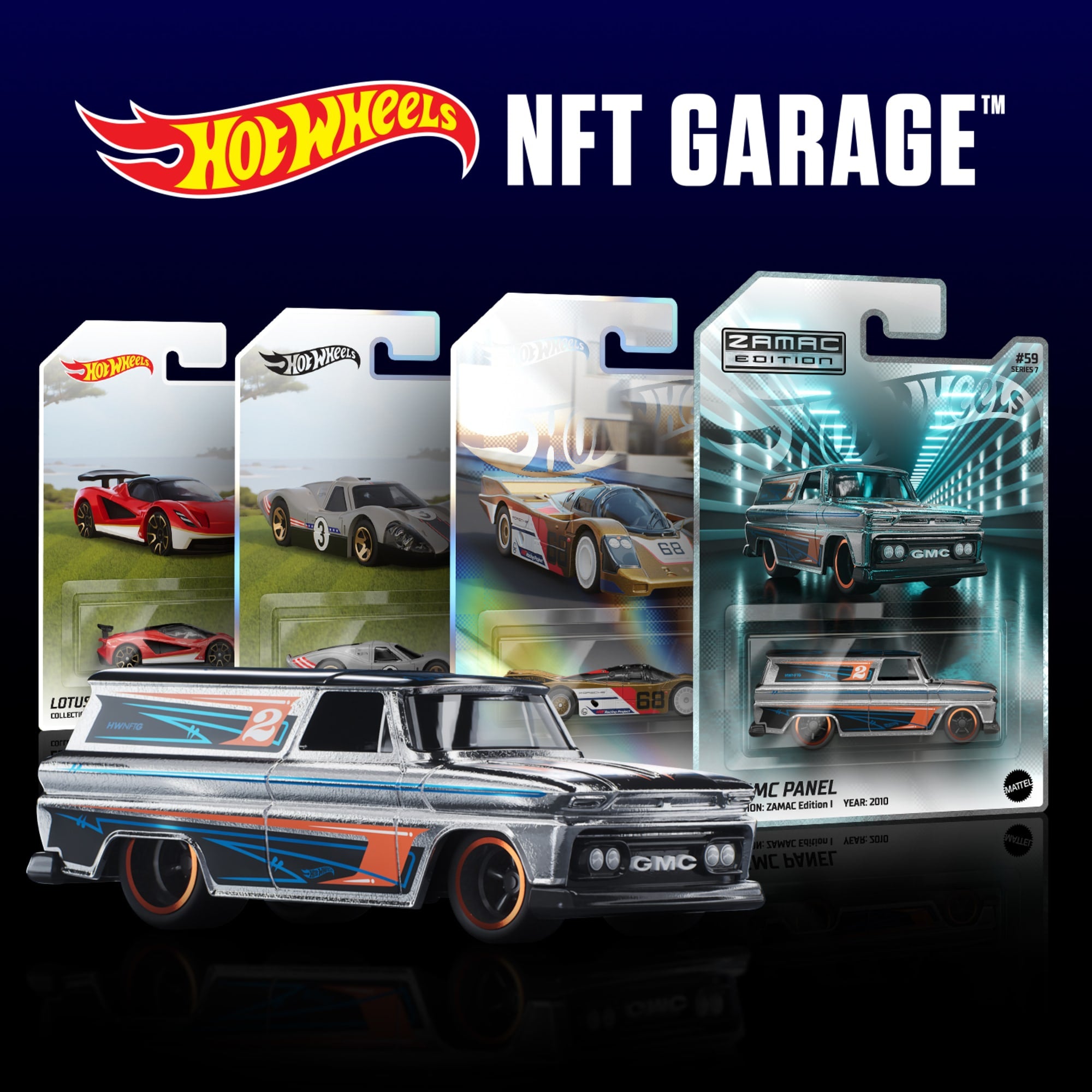 Hot Wheels NFT Garage Series 7 features 40 castings across four pulse-pounding themes. with 60 total variations overall. Our Premium Pack gives you the opportunity to earn one of our Premium die-cast cars. and it’s the only pack where you’ll have the opportunity to land the ZAMAC version of the ’64 GMC Panel. These real-world editions will be produced in some of the lowest quantities we make for any of our castings.