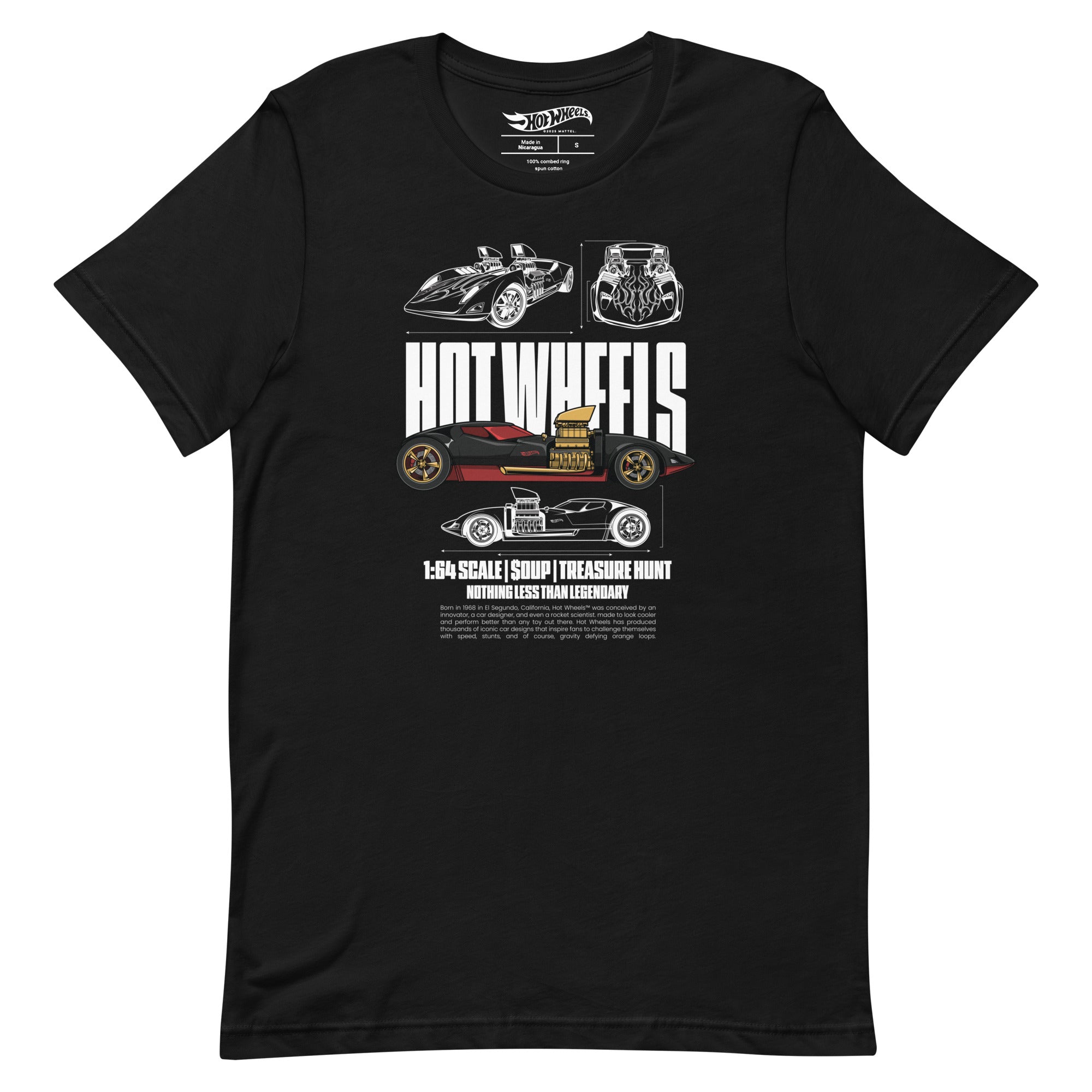 This Hot Wheels Nothing Less than Legendary Black T-Shirt is everything you’ve dreamed of and more. It feels soft and lightweight. with the right amount of stretch. It’s comfortable and flattering for all. This exclusive Hot Wheels design is only available through Mattel Creations.