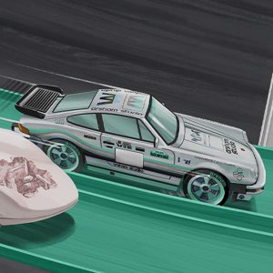 In 1968. Otto Kuhni designed iconic illustrations for a series of Hot Wheels Accessory Paks. Our collaboration with Daniel Arsham includes a series of posters that recreate these dynamic works of art. featuring Arsham’s unique design aesthetic. Inspired by the vintage Competition Pak packaging. the Twin Mill and Arsham-livery Porsche 930A are caught approaching the finish gate for Lap 3 of our collab. with the race results lost through the passage of time.