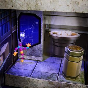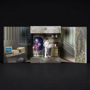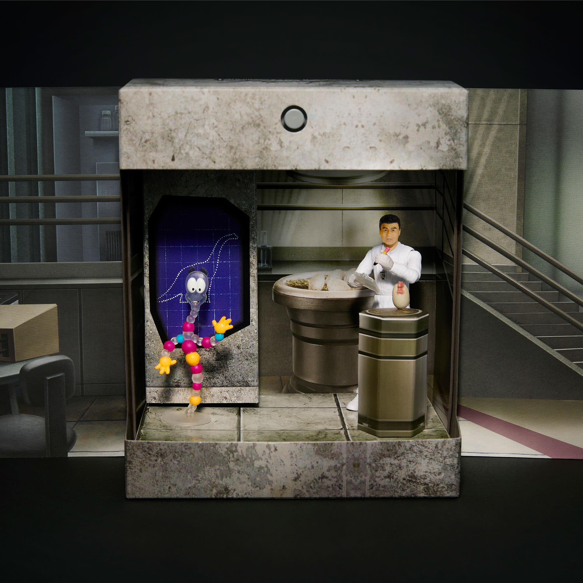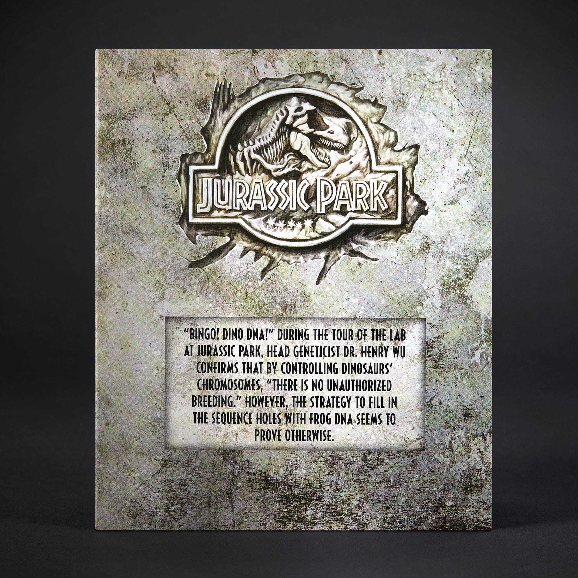 The journey opens in the unboxing. Breach the security system doors to enter the lab. where lights flicker ominously. The packaging includes film details. an egg incubator. and other testing equipment. There are even sounds. as Dr. Wu and Mr. DNA have 4 button-activated phrases triggered through a button on the packaging.