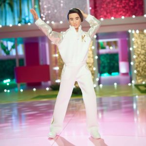 Ken makes quite the statement in his white and gold disco tracksuit. Inspired by one look in Barbie The Movie. his fashion features a working zipper and real pockets. The metallic accent fabric adds deluxe detail to his cinematic look. Celebrating Barbie The Movie. this Ken doll makes a great gift for fans and collectors alike.