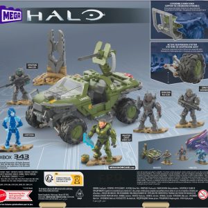 This buildable Warthog vehicle from Halo: The Series is modeled after the version seen in the all-new television series. It features rolling wheels. a cargo rack to carry the included Keystone. shock-absorbing suspension and a rear-mounted turret that pivots and can be manned by 1 of the 5 included figures: Spartan KAI-125. Spartan Riz-029. Spartan Vannak-134. Cortana or Master Chief John-117.