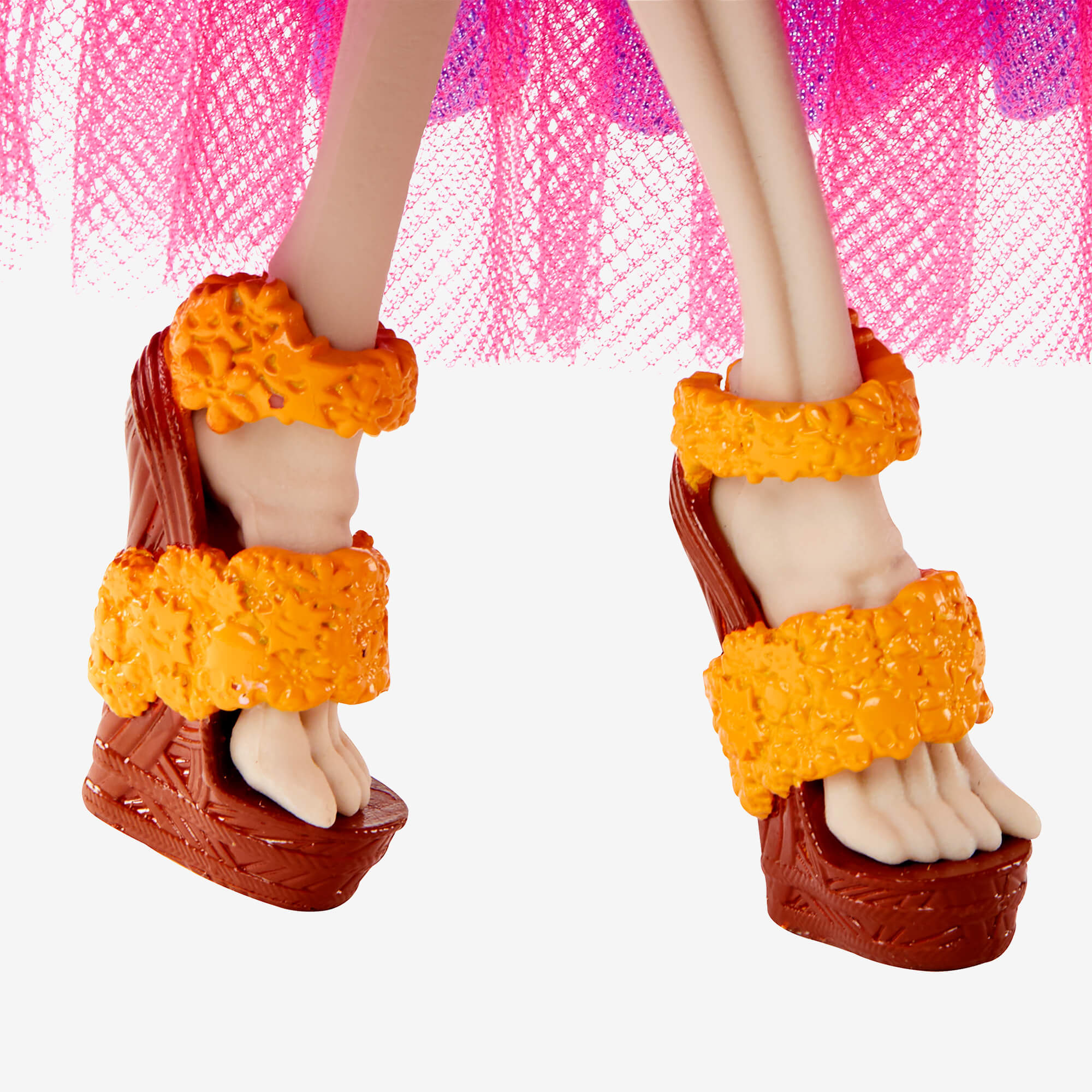 Monster High created a beautiful Skelita Calaveras Howliday doll to honor the rich heritage of Día de Muertos. Skelita doll’s sugar skull face is framed by dark. teal-highlighted hair and a monster marigold headpiece while her statement necklace and sparkly bodice complement her festive look. She’s wearing a boo-tiful dress printed with monster lace. skullette sugar skulls and monarch butterflies. A pink tulle hem grazes her stunning platform wedges featuring chunky straps with monster marigold details.