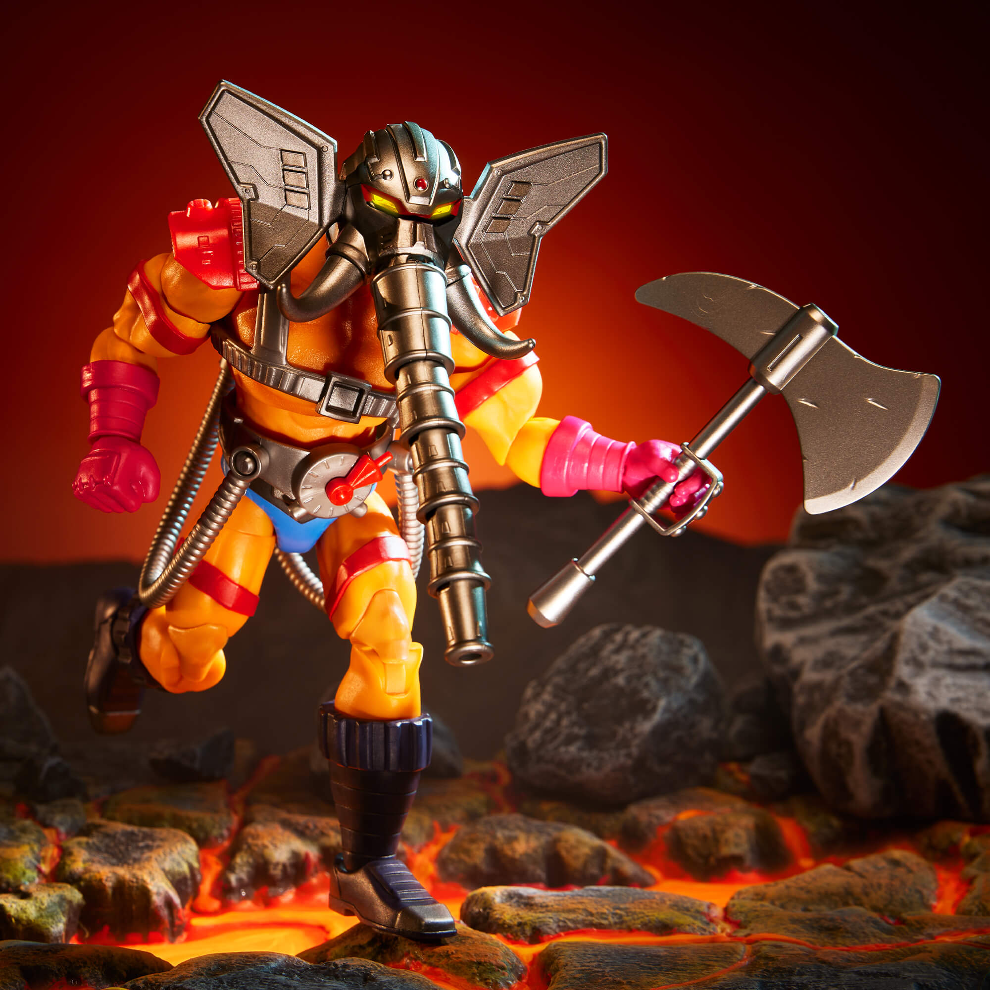Snout Spout. the Eternian firefighting cyborg. is back and bigger than ever. This oversized Masterverse figure of the heroic firefighter towers over most villains. With a removable water tank and hoses along with his iconic axe. he can douse fires and evil-doers with his water blast effect.
