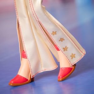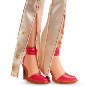 Looking just as fab as she did in her 2002 debut. My Scene Barbie Doll is back and ready to live it up in the big city with her besties. Madison and Chelsea. Her glossy red moto jacket and split-hem flare pants are complemented by a pleather newsboy cap. tinted sunnies. a matching belt. and a glam handbag. Wavy blonde hair with crimped accent pieces frame her original face sculpt. Who’s ready for an iced coffee run?
