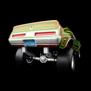 Our AMC Javelin AMX is pure ’70s nostalgia with a heaping helping of Street Freak culture. First. we gave it the classic Grandma’s Kitchen deco with root beer Spectraflame paint. entwined with ’70s-style greens and yellows. Then we enhanced this mean street-racing machine with after-market exhaust systems. an exposed engine. multi-piece leaf spring molded suspension. and ladder bar details.