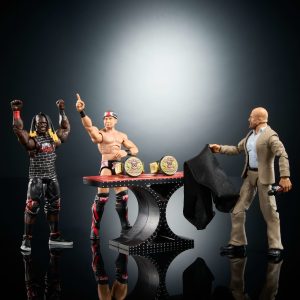 - The set includes multiple accessories like a swappable pair of hands for each figure. a microphone. table. 2 Tag Team Championship Titles and more!
