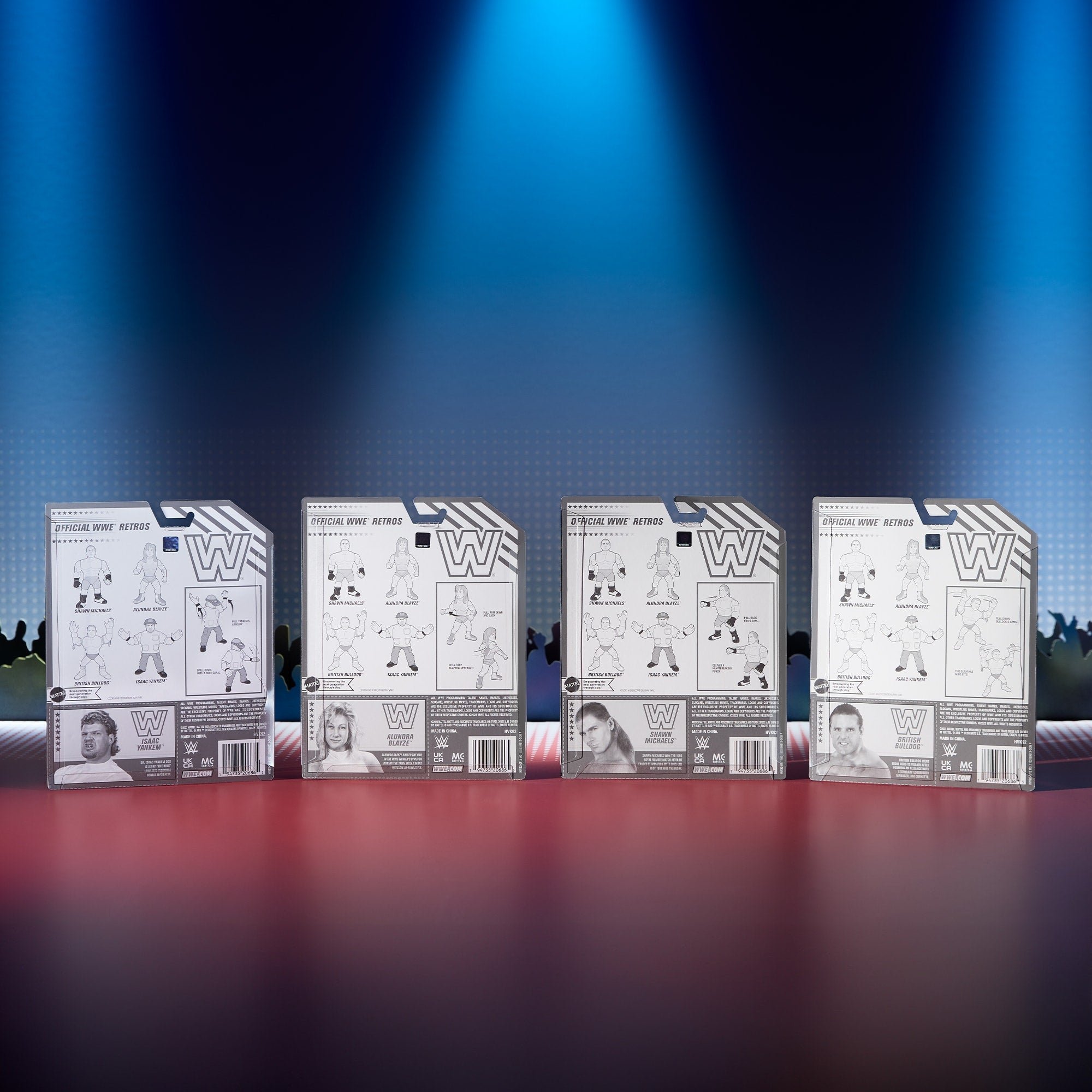 Relive the glory days of the 1990s WWE® with this Retro 4-Pack Bundle featuring British Bulldog™. Shawn Michaels™. Alundra Blayze™. and Isaac Yankem™. Unique action features let you battle it out with their signature moves. This complete set of Wave 6 figures is individually sealed in nostalgic classic WWE action figure packaging and arrives in a commemorative ’90s-themed shipper box to celebrate the four figures in their heyday.