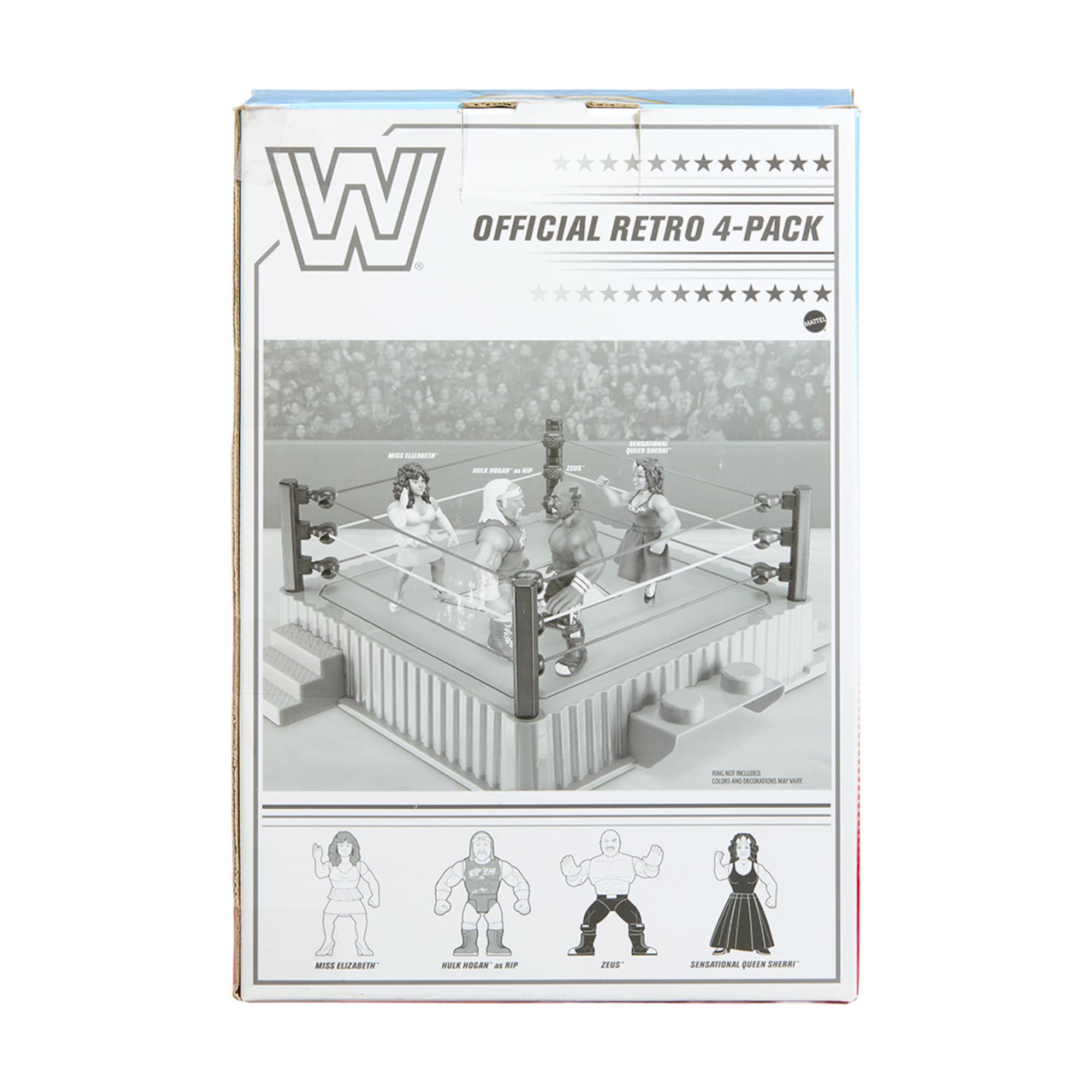Relive the glory days of the 1990s with our WWE® Retro Collection 4-Pack featuring Superstars Miss Elizabeth™. Hulk Hogan™ as RIP. Zeus™. and Queen Sherri™. Unique action features let you battle it out with their signature moves. This complete set is individually sealed in nostalgic classic WWE action figure packaging and arrives in a commemorative ’90s-themed shipper box to celebrate the four figures in their heyday.